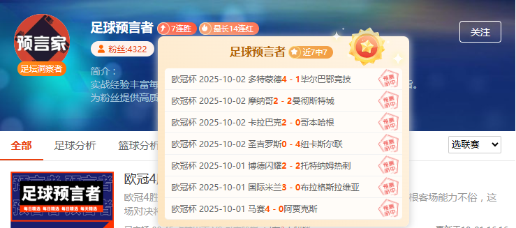 欧战连中:近日欧冠预测屡传歪嘎,精准捕捉多特蒙德、摩纳哥等多场赛果!
