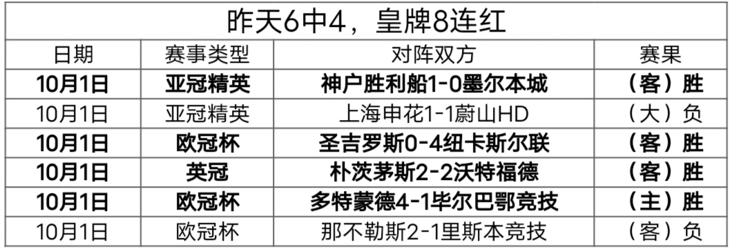 【战绩回顾】昨天文章拿下6中4 的成绩,皇牌场次依然过关,今晚冲击9连胜。今天主打亚冠2+欧罗巴杯,再接再厉,欢迎继续关注博士动态。