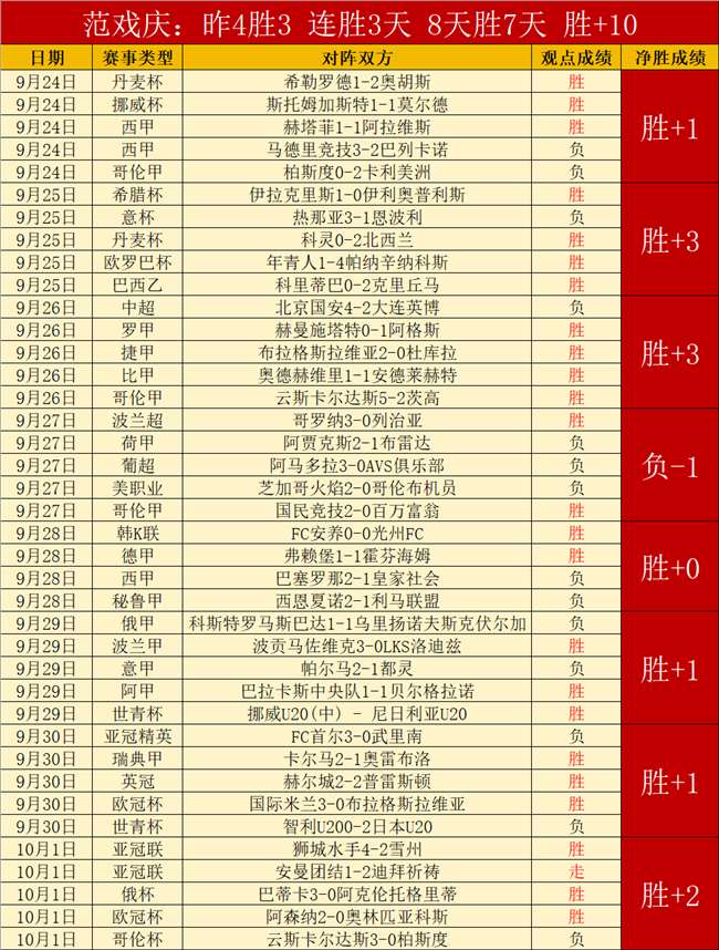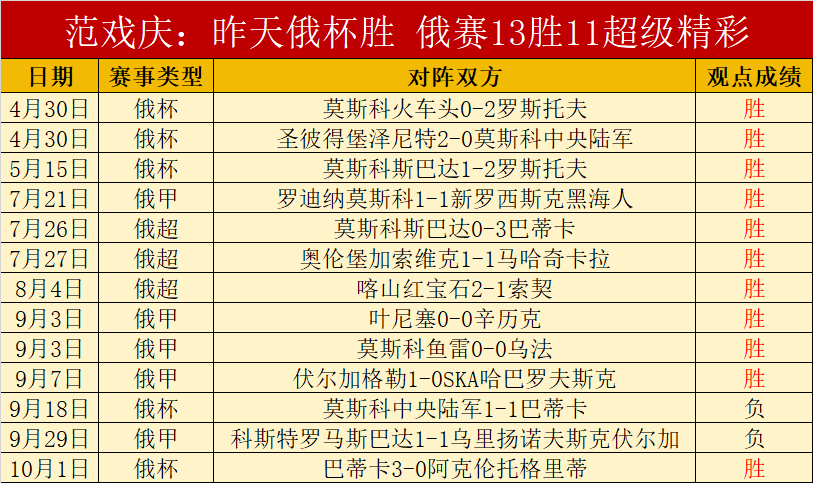 俄杯昨天胜利,俄赛来到13胜11的精彩时段。昨天4胜3,连胜3天,8天精彩7天,胜+10,胜利状态继续保持,胜利占据主流。9月15日打出10连胜,17连胜记录也是在近期出现的,大胜是频繁出现的高超实力。