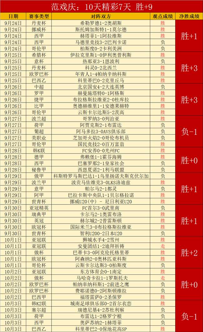 10天精彩8天,胜+9,胜+增长速度值得认可。9月15日打出10连胜,17连胜记录也是在近期出现的,大胜是频繁出现的高超实力。