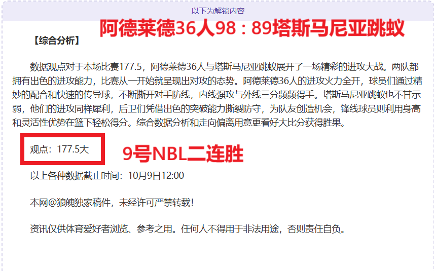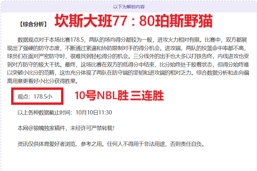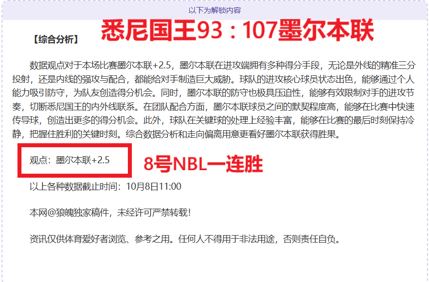 【成绩回顾】NBL近三天全胜,每天NBL获得一胜,昨日3场比赛获胜,新一期赛事继续关注赛事延续胜利,作为本网资深作者和篮球分析师实力有目共睹,擅长拆解数据用意,连胜佳绩历历在目,笔者将再接再厉争取得更佳战绩回馈粉丝,本场比赛将精选一场优质情报,敬请关注。
