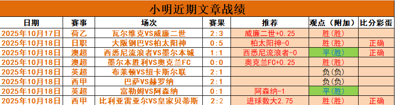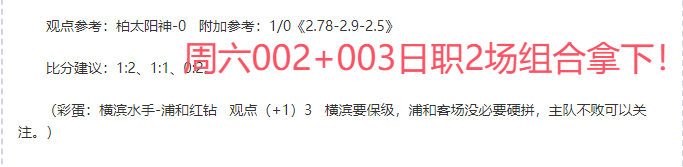 【上期回顾】状态恢复,继续加油!昨文章7中5,奥克兰、柏、贝蒂斯大格局成功打出,阿森纳、西悉尼打平,近8中6。昨顺利拿下柏+横滨水手3600%日职组合方案,早场3中3,表现超神。周日争取完美收官加油!