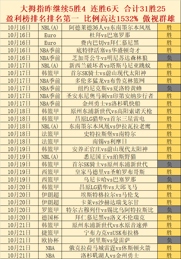 NBA昨天两场全胜,精彩拿下4连胜精彩表现。昨继续5胜4,大胜6天31胜25,营利榜第一(1532%)傲视群雄,超级浮夸的精彩!