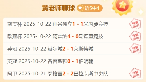 赛事回顾:昨天黄老师发挥出色,4场比赛拿下3场,近期达成了5胜4的好成绩,今日我们继续精挑细选,以稳为主,期待能够再次连胜!
