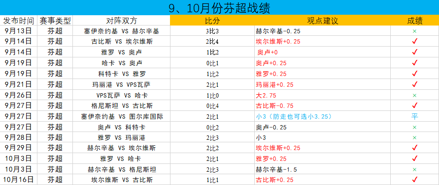 目前状态巨热,整体战绩7连胜,两场亚冠分析已经发给大家了,接下来是不知的芬超信心赛事,以下是不知统计的8、9、10战绩表格,供大家观看,在此也感谢大家的支持,跟随不知一起越来越红!!