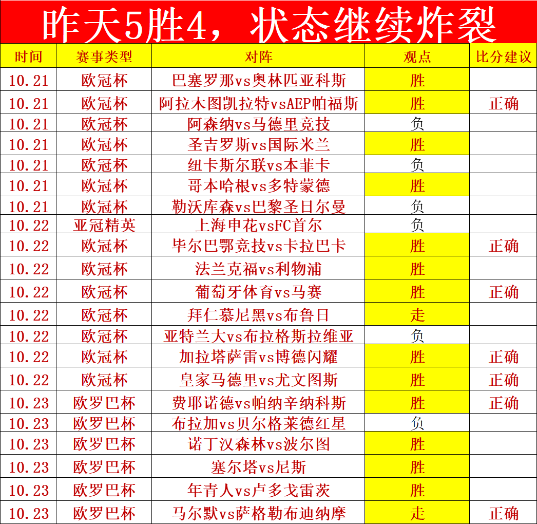 一、战绩回顾:昨天状态继续炸裂,拿下5胜4的佳绩,近期解锁贴表现出色,王牌再次顺利拿下,近期欧冠、欧罗巴打得非常漂亮,今天炸裂状态继续。