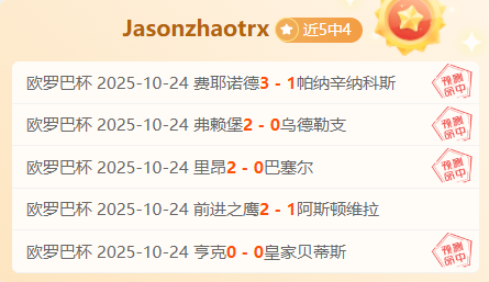 【战绩回顾】命中比分欧罗巴杯赛费耶诺德3-1帕纳辛纳--里昂2-0巴塞尔--弗赖堡2-0乌德勒支,命中比分欧冠比利亚雷亚尔0-2曼城,命中比分南美杯山谷独立1-1米内罗竞技,命中瑞超比分哥德堡0-2米亚尔比,命中意甲比分克雷莫纳1-1乌迪内斯,命中德甲比分弗莱堡2-2法兰克福,海登海姆2-2云达不来梅,拜仁2-1多特蒙德,命中德乙比分纽伦堡1-1荷印尔斯泰因,瑞超近5胜率80%,德甲近13胜率77%,韩K近4胜率75%,