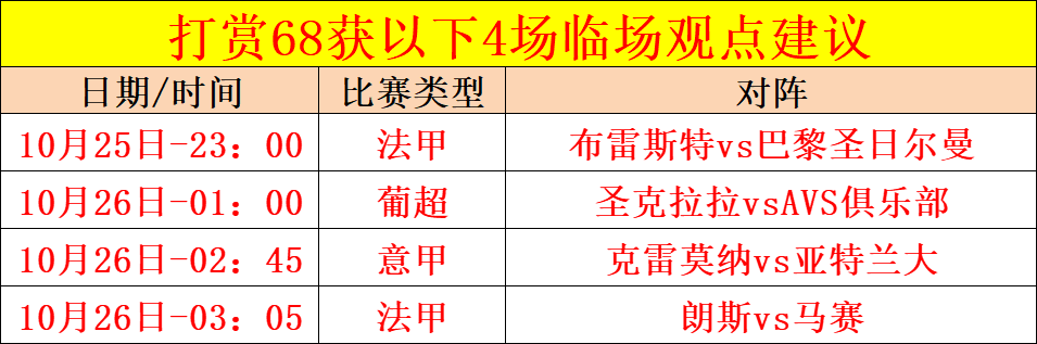 注:今日打赏68可获以下4场欧罗巴临场观点建议