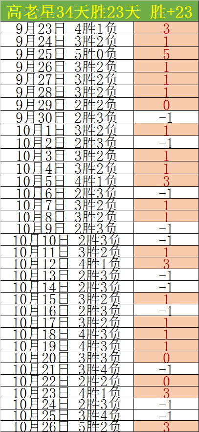 昨7胜5,34天胜23天,合计胜+23,令人惊叹的胜+值得骄傲,胜利清晰地占据主流!