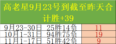昨天胜利发挥,近12天取得11天胜利,合计胜+13,9月23日截至昨天,合计胜+39,骄人胜+发挥