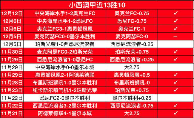 战绩回顾:昨日早场擅长的澳甲是继续拿下!奥克兰FC队在客场是2-1战胜中.央海岸水手队,目前澳甲13胜10,状态火热,今日继续!