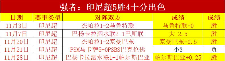 印尼超5胜4,亚系早场赛事发挥出色。昨天平稳发挥,前天5胜4,精彩两天拿下10胜7高胜利标识。近26天仅负值8天胜+20,11月胜+16,10月胜+16,双月保持双位胜+发挥
