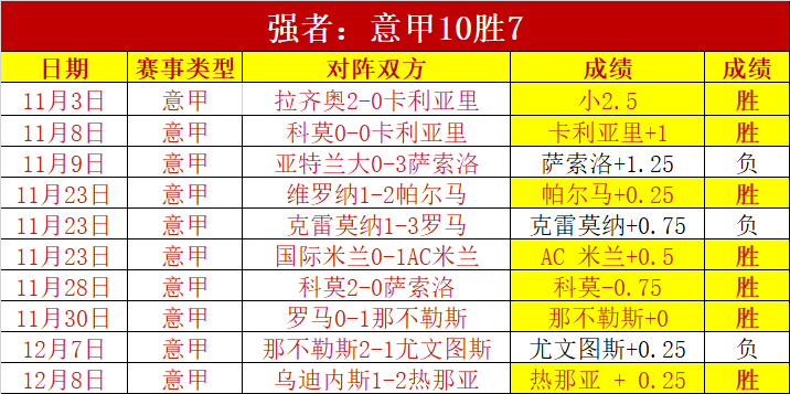 五大联赛目前发挥出色,意甲目前10胜7。11月胜+16,10月胜+16,过去两个月合计胜+32,月成绩非常精彩