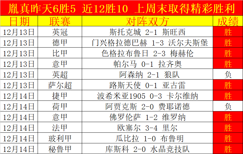 昨天6胜5,大胜2天,近12胜10,精彩时段开启。12月保持正向胜+发挥,11月胜+13,10月胜+12,月发挥非常出色