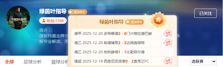 【叶指导优势】2016年国内知名数据分析团队离职,期间组织个人团队深耕足球领域至今已近10年。团队精于情报梳理及数据解读。亚欧赛事数据库全面,见微知著,坚信数据才是解析赛果直观体现。